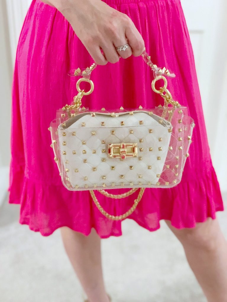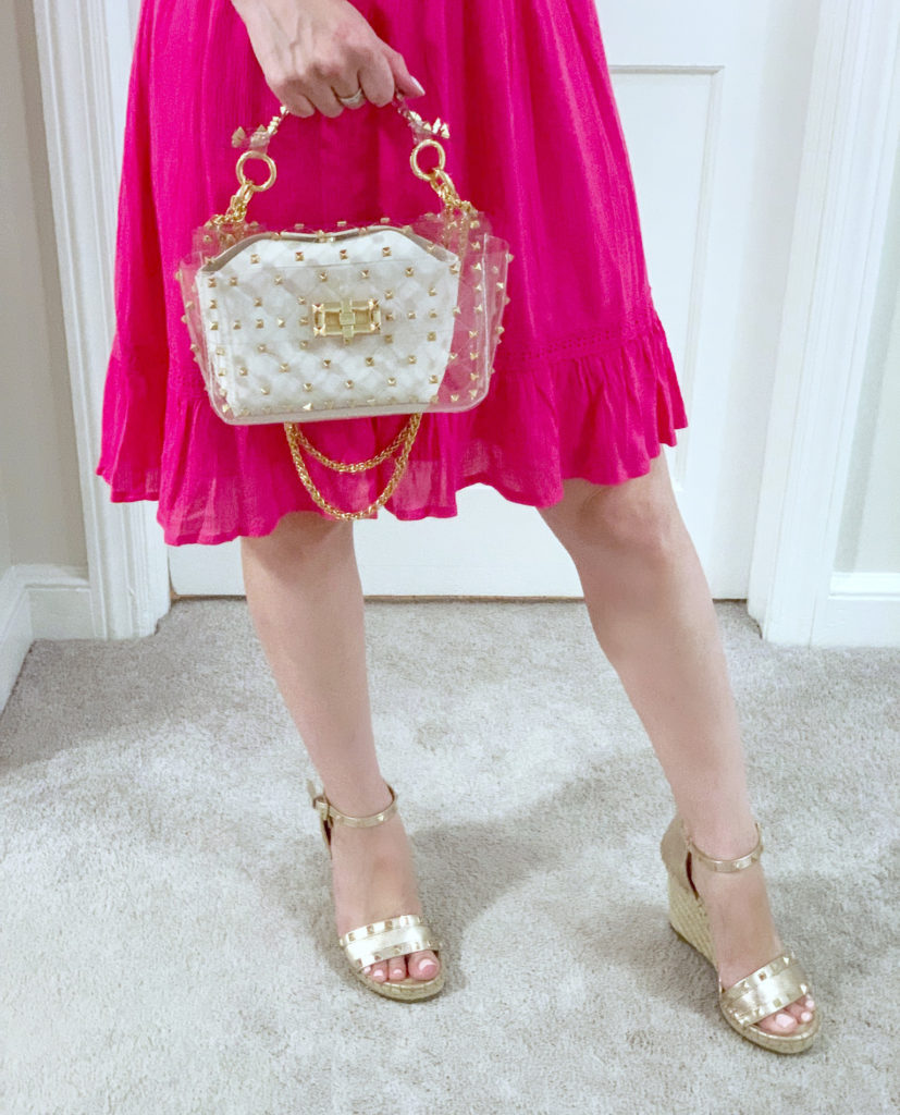 I paired this dress with some rose gold Marc Fisher metallic wedges & a clear metal chain clutch bag.