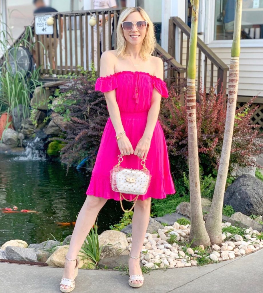I wore this adorable Lulus off the shoulder hot pink dress out to dinner recently. (I’m wearing a size x-small for reference) As soon as I put this dress on it gave me major vacation vibes. Even though summer is coming to an end, this is definitely a great dress to have in your wardrobe for Fall & Winter vacations.